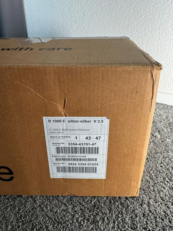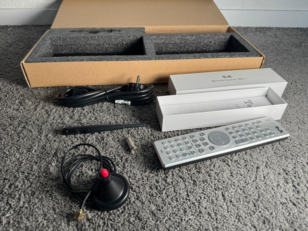 Im Lieferumfang enthalten ist: T+A R 1000 E, Netzkabel, Fernbedienung, Antenne und die originale Verpackung.