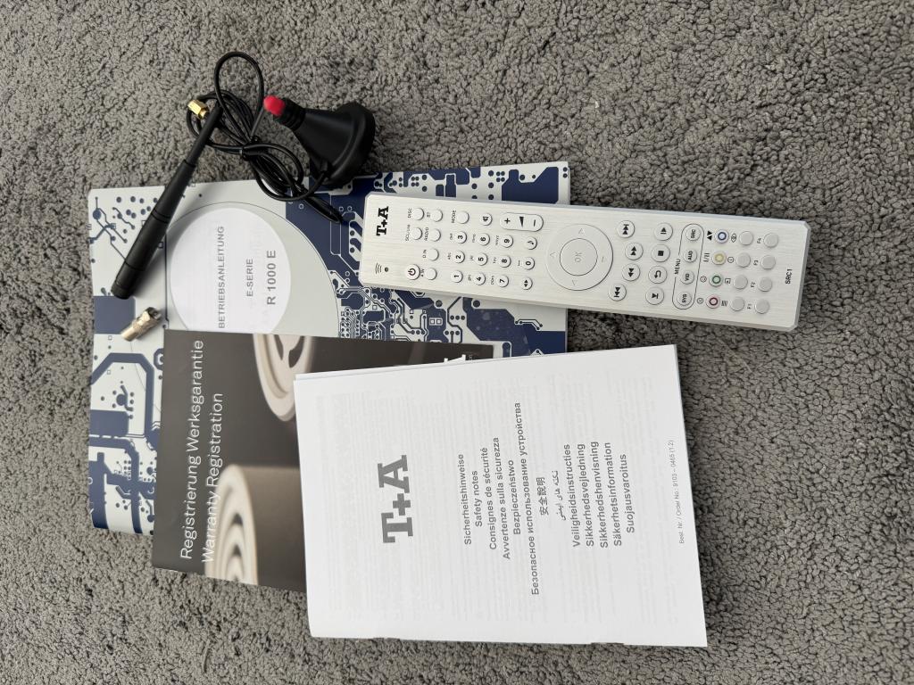 Im Lieferumfang enthalten ist: T+A R 1000 E, Netzkabel, Fernbedienung, Antenne und die originale Verpackung.