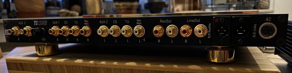 Zum Verkauf steht eine außergewöhnliche Stereovorstufe Tessendorf Audio TE2, ausgestattet mit der seltenen Referenzplatine auf Teflonbasis sowie einem separaten Filter-Netzteil. Die Verarbeitung und klangliche Qualität bewegen sich kompromisslos im High-End-Bereich. Diese Kompromisslosigkeit spiegelt sich auch in der Lautstärkeregelung wider, welche mittels Drehschalter mit Festwiderständen eingestellt wird. Das Gerät ist nicht fernbedienbar. Eine weitere Besonderheit ist die CNC-gefräste, 15 mm dicke Frontplatte mit schweren Messingknöpfen und gravierter Beschriftung. Zudem wurde das Gerät mit speziellen Füßen versehen. Die Vorstufe ist komplett als Hochpegelversion - ohne Phono - ausgelegt.
