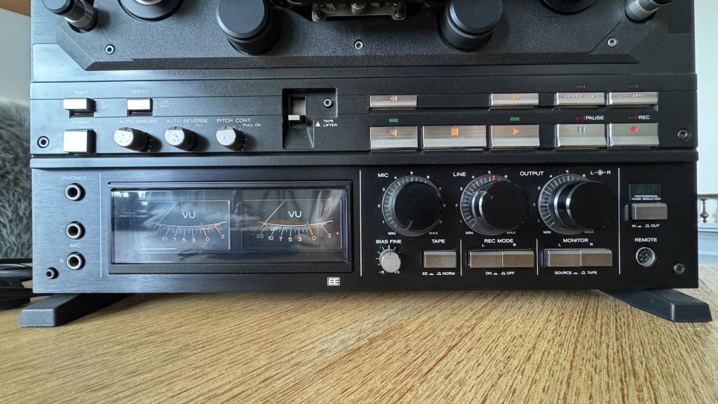 26,5 cm-Spulen, 2 Geschwindigkeiten (9,5 u. 19cm/Sek), Bidirektionaler Betrieb (Autoreverse) mit 2 Tonwellen, 4 Kobalt-Tonköpfen/ 2 Löschköpfe, geregelter Doppel-Capstanantrieb, DBX-Rauschunterdrückung, 3 direktgetriebenen Gleichstrom-Motoren, LED-Bandzählwerk in Echtzeit, EE-Band-tauglich . . . u.V.m.