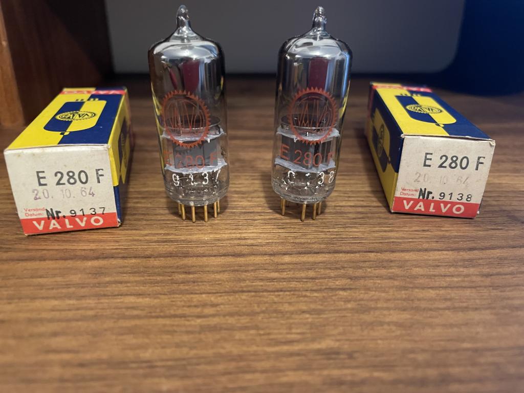 7) Valvo E280F Gold Pins, red series (Serial 9137+9138!), NOS, NIB, Made in Holland (Heerlen), ultra rare, (SOLD)