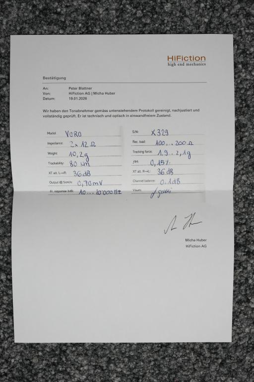 Der Tonabnehmer wird mit wenigen Betriebsstunden frisch justiert und kontrolliert ab Werk mit Bescheinigung per 19. 1. 2026 für einwandfreien optischen und technischen Zustand verkauft.