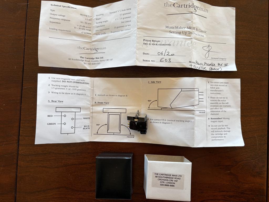 Up for sale, a real collector's item: The Cartridge Man Music Maker III cartridge in excellent condition - less than 50 hours of listening time, original packaging and cartridge guard included, as well as user manual (signed by the manufacturer), original box and latest generation black "Isolator" (as pictured).