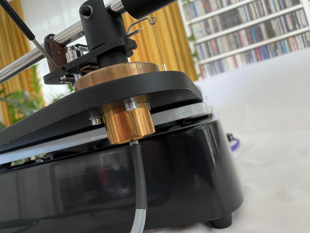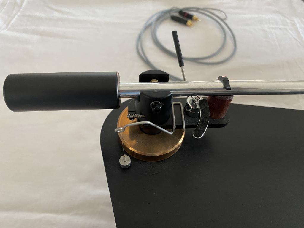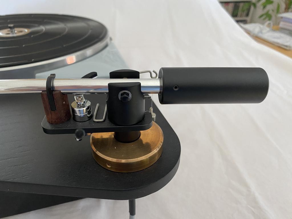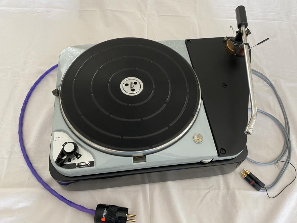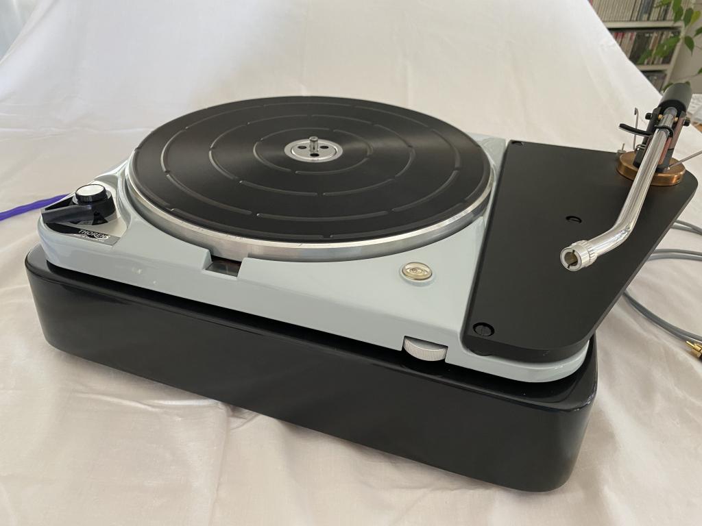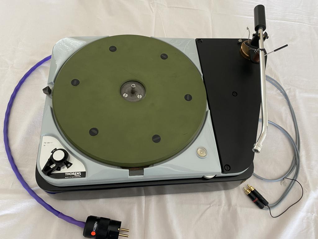 in sehr schwerer massiver Konsole (Hochglanz schwarz); mit legendärem überholtem E50 Motor; entkoppeltes Tonarmboard aus Panzerholz von Kirschner mit speziell angefertigtem Bronze-Fitting für Schick Tonarm; Schopper Mushrooms; Motoraufhängung von Hanze (Originalteile von Thorens vorhanden); Nordost Netzkabel.