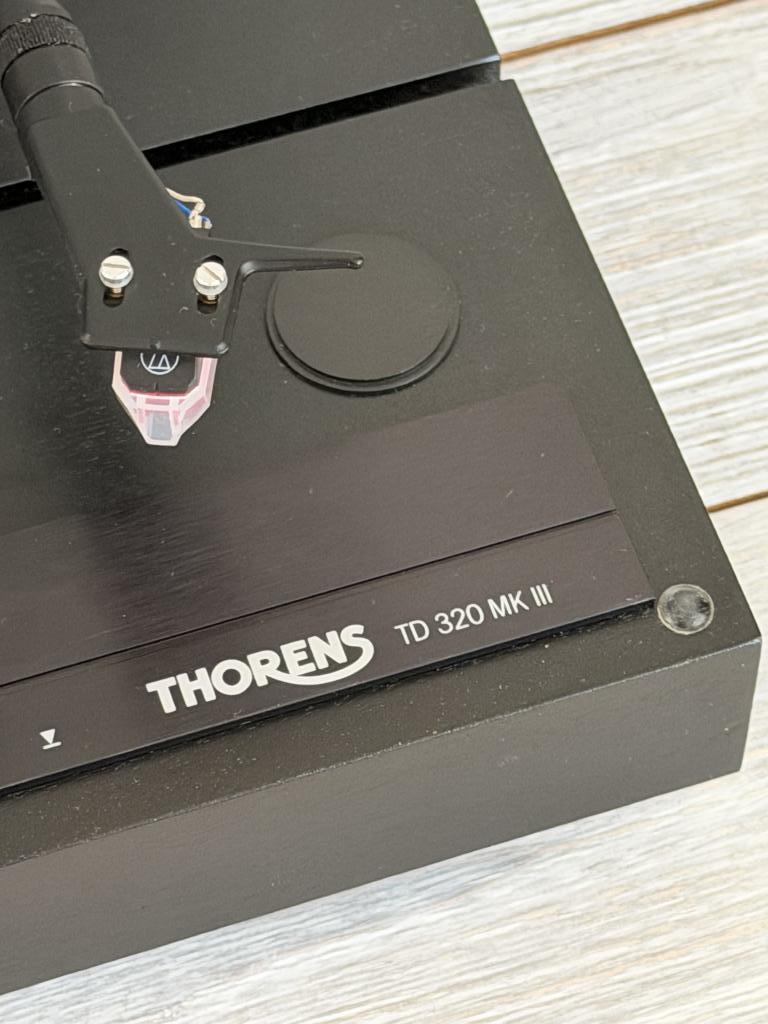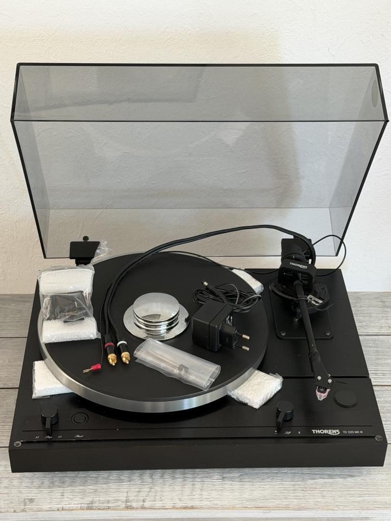 Thorens TD320 MK3 mit Thorens Tonarm und AT-VM95ML Tonabnehmer, Phonokabel, Plattengewicht, zusätzlicher Tonarmlift. Der Plattenspieler wurde 2020 durch Thrones Guru Arno Schreder für allein Euro 600,-- aufgearbeitet.