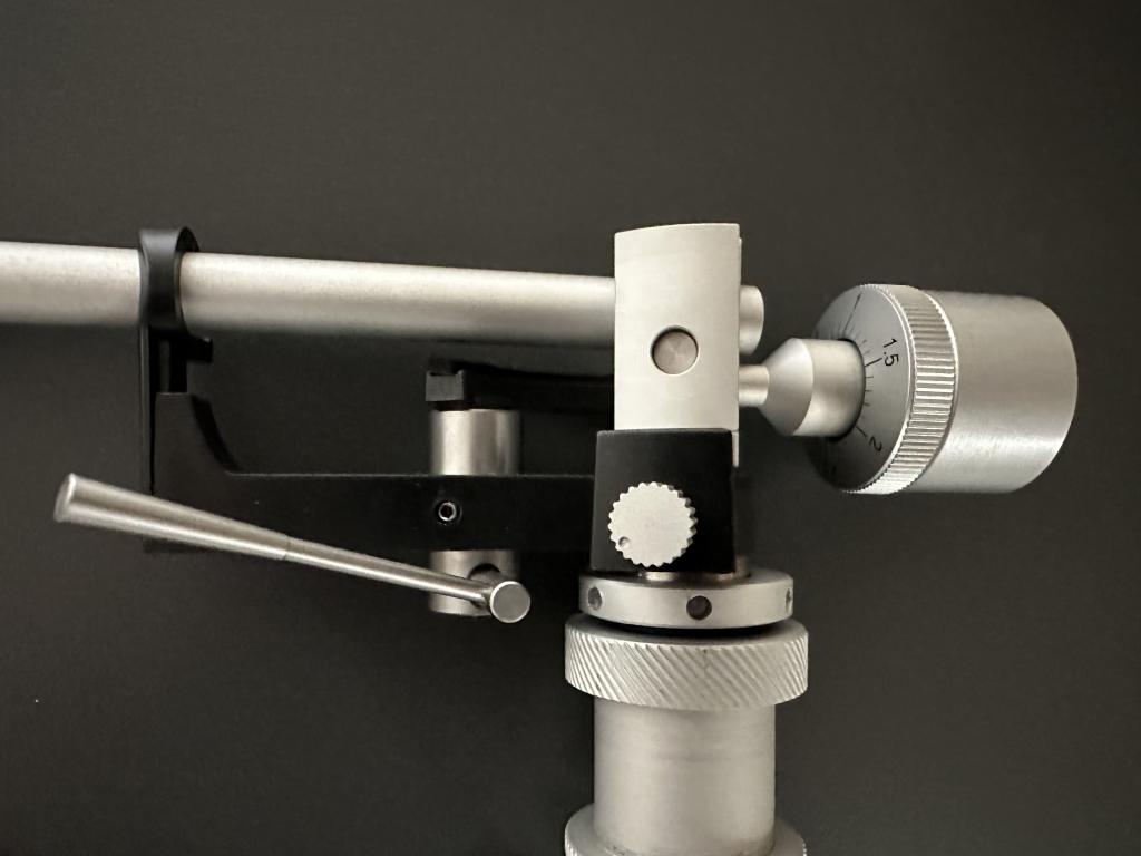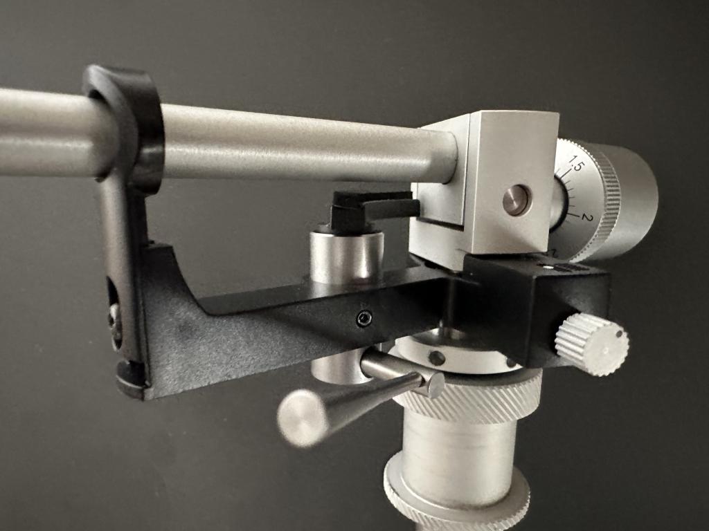 Der komplett neu entwickelte TP 92 ist ein kardanisch aufgehängter 9-Zoll Tonarm mit Löfgren-Geometrie. Als Horizontallager kommt ein hochpräzises japanisches Kugellager mit Spezialöl zum Einsatz.Das Lager liegt unterhalb des Tonarmrohrs auf Nadelhöhe, was für Stabilität und Ruhe sorgt. Auch das durch zwei Gummiringe entkoppelte Gegengewicht zur Einstellung der Auflagekraft liegt exakt auf Nadelhöhe.