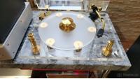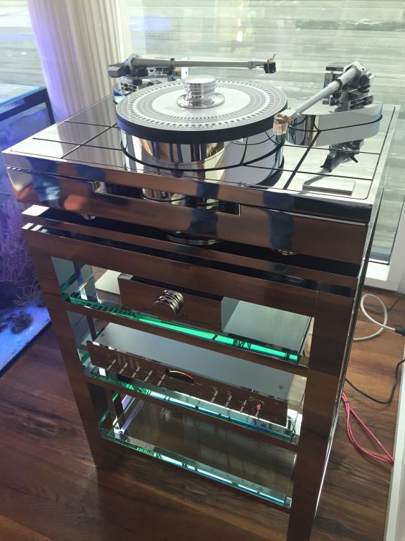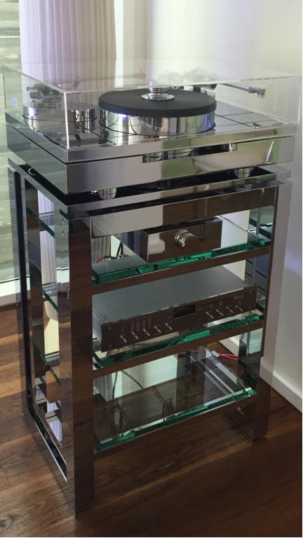 Durch den Wunsch des Kunden nach einer Haube kam für das Transrotor-Team die nächste Herausforderung, da es keine passenden Scharniere am Weltmarkt gab, wurden diese selber entwickelt und für diesen Plattenspieler gefertigt. Somit sind die beiden herrlichen 12 Zoll SME Tonarme mit ihren MC Abtasten ( Fuuga Miabe und Kondo IO-M mit Kondo CF-Übertrager ) gut geschützt.