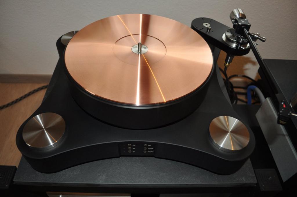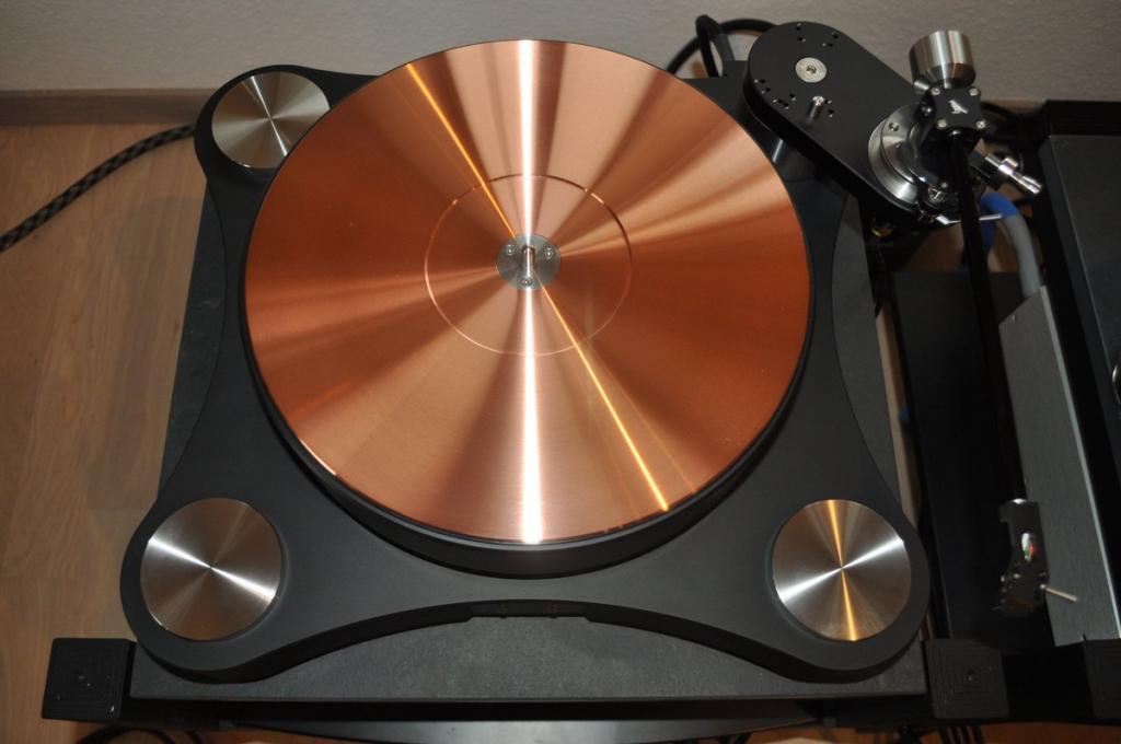 Beim Teller handelt es sich um eine Sandwich Konstruktion mit eingelassenem Oberteil aus massivem Kupfer, er hat ein Gewicht von 12 Kilogramm.