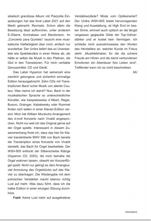 Verbunden mit vielen Ausstattungsdetails und Besonderheiten, die das Herz jedes audiophilen Musikfreundes höher schlagen lassen, sind seine klanglichen Fähigkeiten so beeindruckend, das die damit verbundenen Emotionen nicht nur die unabhängige Fachzeitschrift HÖRERLEBNIS überzeugt haben sondern auch die AUDIO/STEREOPLAY in Ausgabe 12/25.