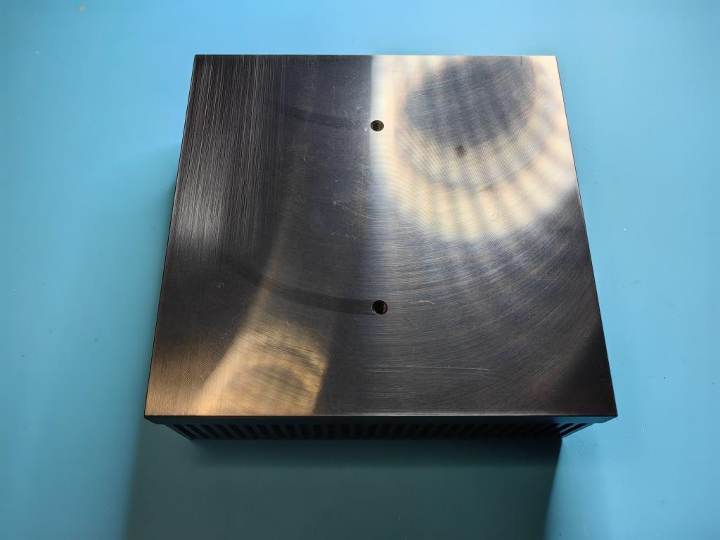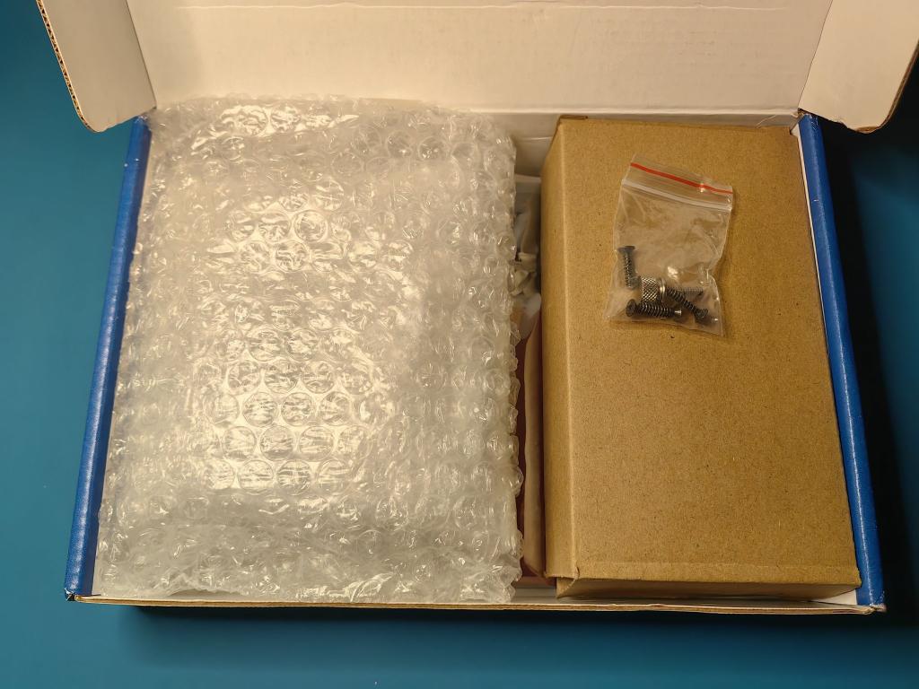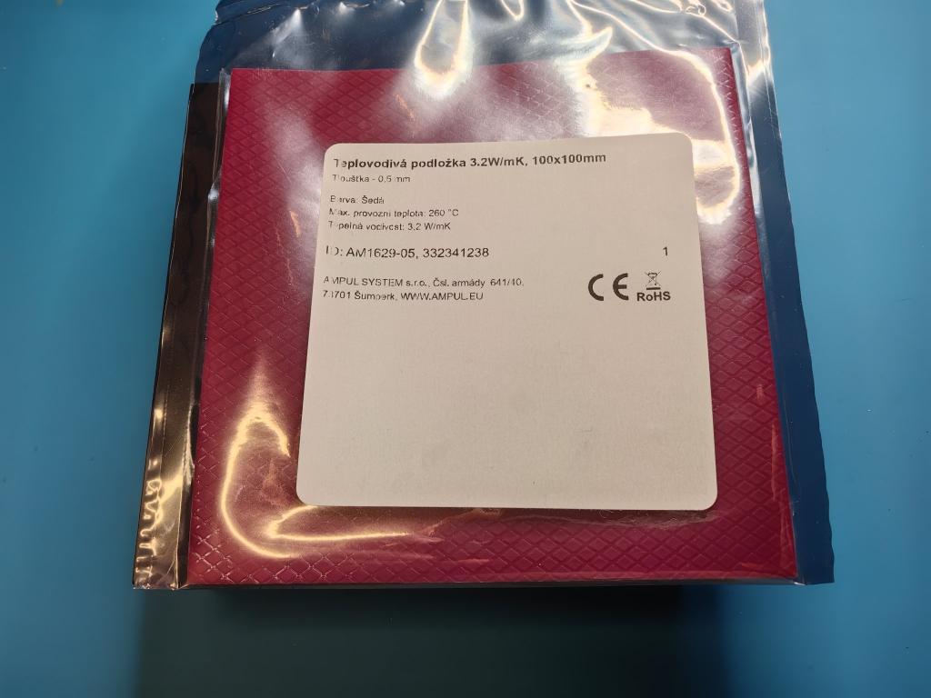 - a hefty 10x10 cm heatsink (0,5 kg) with one unused thermal pad. Helps not only with heat dissipation, but also stability when connecting more rigid cables.
