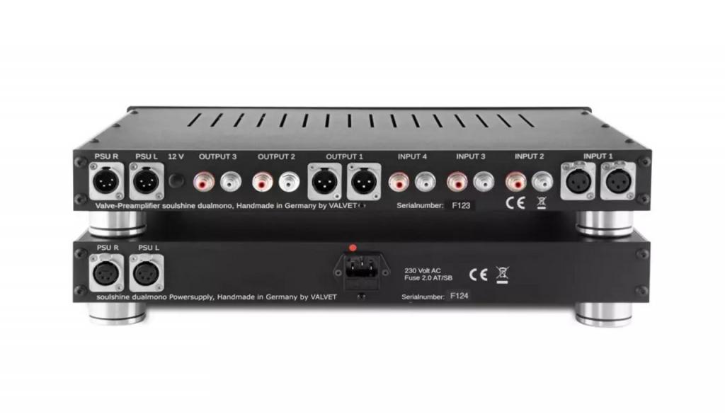 kompletter Doppelmonoaufbau incl. eines externen Doppelnetzteils, fernbedienbarer 48- oder 64-poliger Stufenschalter für die Lautstärke mit dim- und abschaltbarem Display. Feinste „custom made for VALVET“ Koppenkondensatoren (MCap-EVO silber/gold von Mundorf)