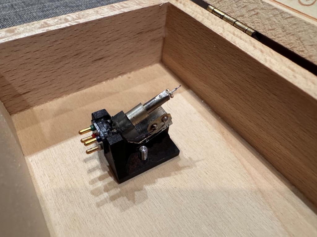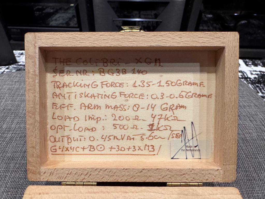 I'm selling a Van Den Hul Colibri XGM. The cartridge is new, and I never got around to buying a turntable that could drive it properly. The technical specifications are visible in one of the photos.