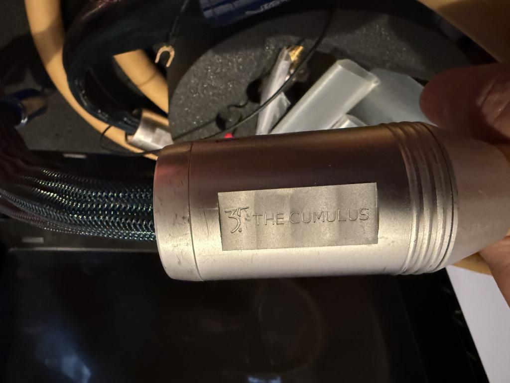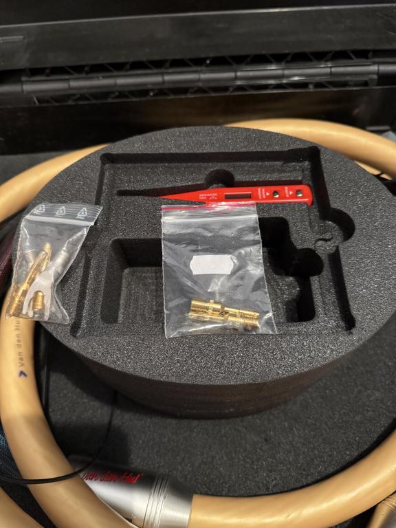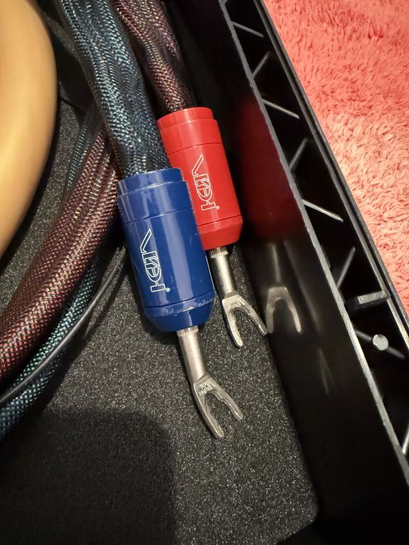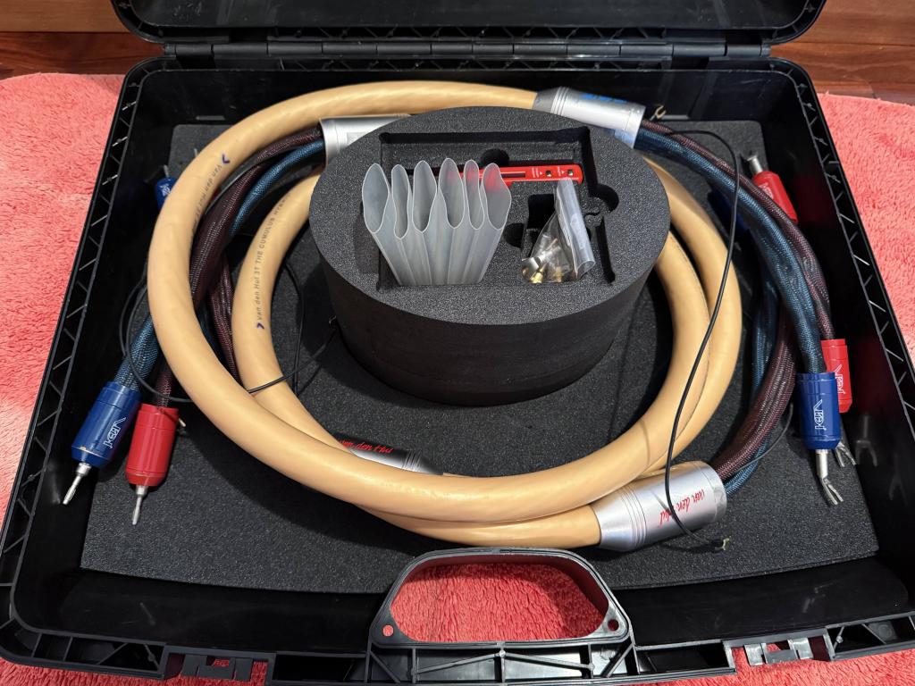 A pair of top-of-the-line cables, a technological achievement from the brand. Effective pin-to-pin length of 2.10 meters. Used with great satisfaction for about 3 years, selling due to a project change. The cables are very stiff and heavy to handle and have some marks on the aluminum terminals. They are terminated with interchangeable banana/fork connectors. Includes 4 banana connectors and two spare forks.
