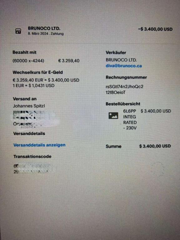 Kaufdatum: 8. März 24 um 3.400 Dollar = 3.259 € + einen beachtlichen Betrag an Einfuhrzoll/Einfuhrumsatzsteuer.