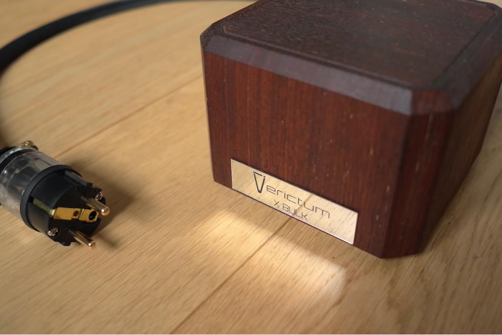 The X Bulk is handcrafted using EMI/RFI suppression modules designed for industrial applications and optimised for audio. The modules are frozen in nitrogen using a specially developed process, then permanently immersed in resin. The conductor is cryogenically treated silver (4N purity). The casing is made from exotic merbau wood.
