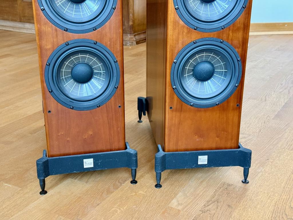 ACHTUNG: Das abnehmbare Lautsprechergitter ist beschädigt. Ich habe das aber seit Jahren abgenommen, weil ich den freien Blick auf die Lautsprecher schöner finde. Wenn Sie das Gitter verwenden möchten, müsste es neu bezogen werden.