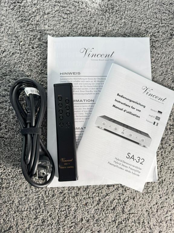 Im Lieferumfang enthalten ist: Vincent SA-32, Netzkabel, Anleitung, Fernbedienung und die originale Verpackung.