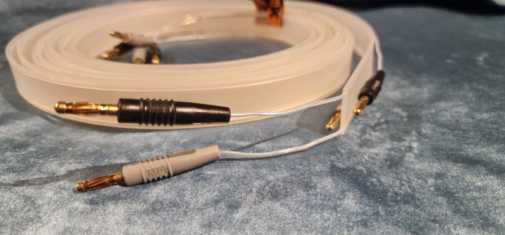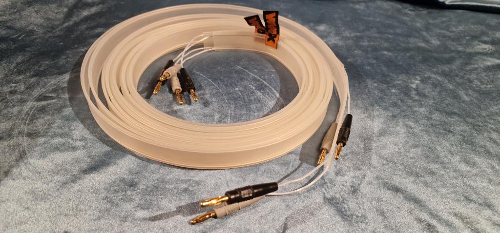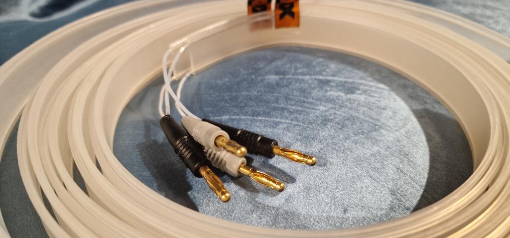 Flachband solid core Lautsprecherkabel mit extrem großem Abstand der Leiter zum optimalen Anschluss passiver Lautsprecher.