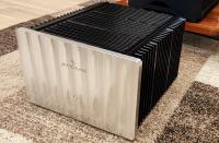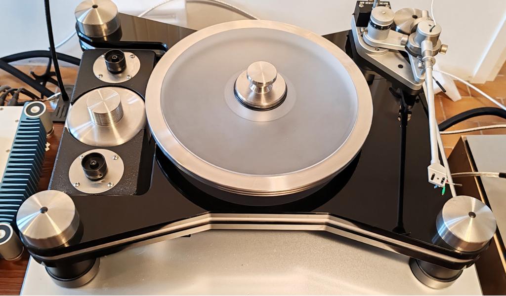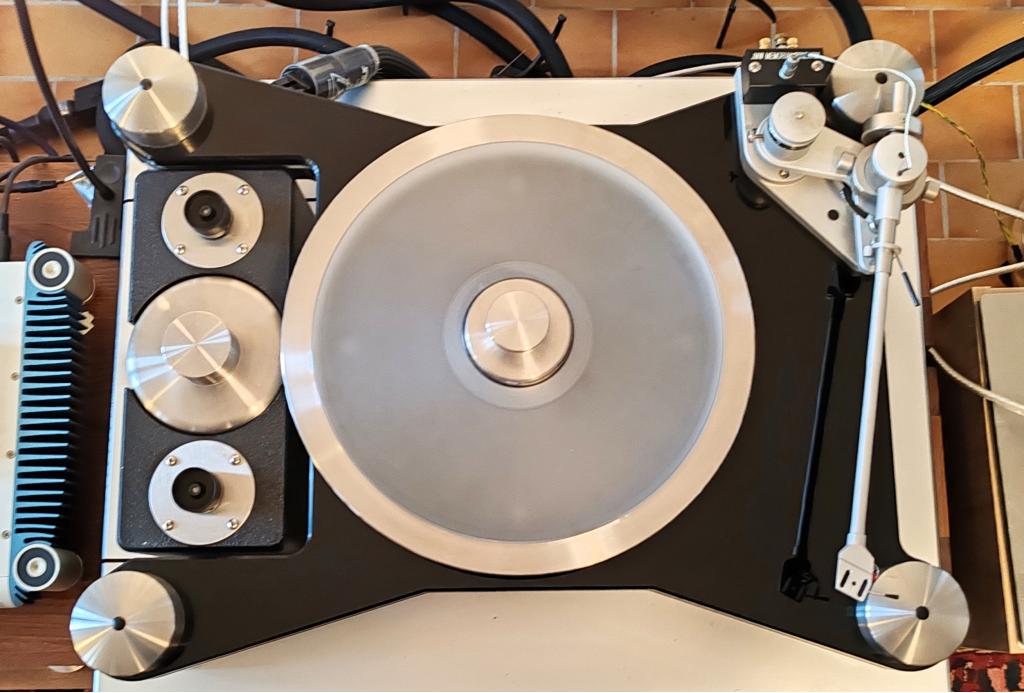 Built on a composite, triple-laminated acrylic and aluminum chassis, a new inverted bearing with a Teflon thrust plate was chosen for its frictionless performance and immunity to wear. A radical outer-periphery record clamp flattens the LP to the acrylic platter.