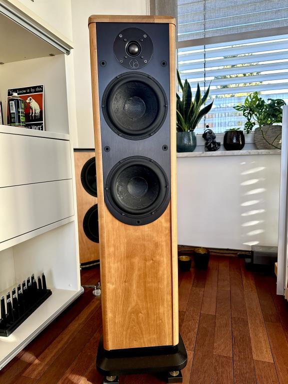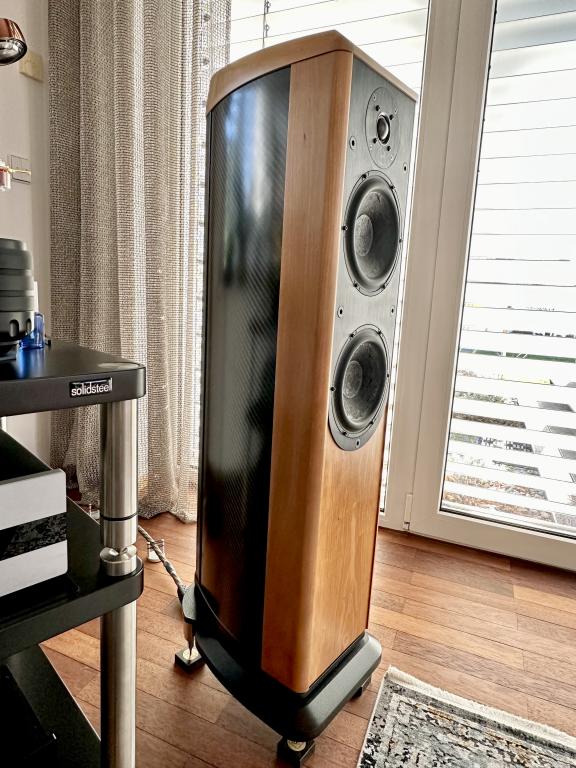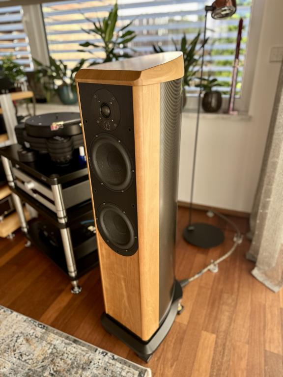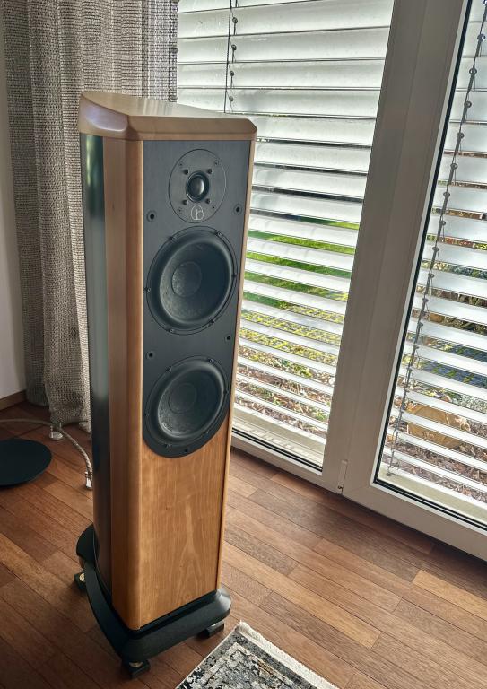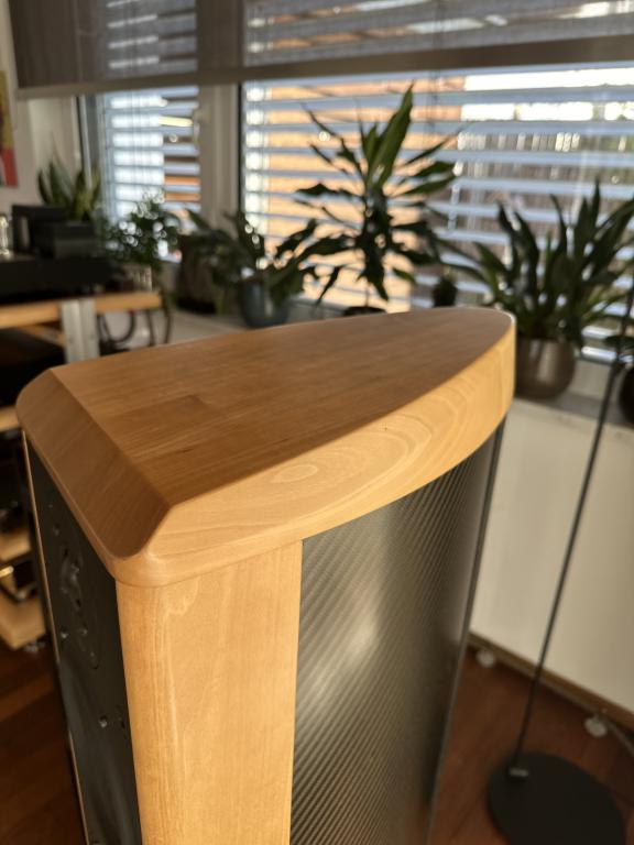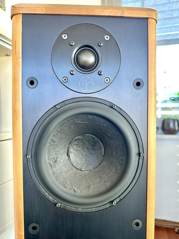 Ich biete meine Wilson Benesch A.C.T. One Standlautsprecher an. Die Lautsprecher sind in sehr gepflegten Zustand (technisch und optisch) und stammen aus raucher- und tierfreiem Haushalt. Sie wurden bei Hifi-Studio Wittmann in Stuttgart-Botnang gekauft. Die Originalverpackung und Frontabdeckungen sind vorhanden. Die gekrümmten Gehäuse helfen stehende Wellen im Boxeninneren zu vermeiden. Die Lautsprecher sind sehr aufwändig konstruiert und perfekt verarbeitet. Sie bestehen aus Kirsche Vollholz, Kohlenfaser-beschichteten Wabenwerkstoff Nomex Seitenwänden und einer 10mm starken Aluminium Frontwand, ohne parallel Wände. Im Boden ist eine 10mm dicke Stahlplatte verbaut. Die Boxen stehen auf Spikes aus gehärtetem Stahl. Mitgeliefert werden je vier Q-Damper. Die Treiber stammen von ScanSpeak.