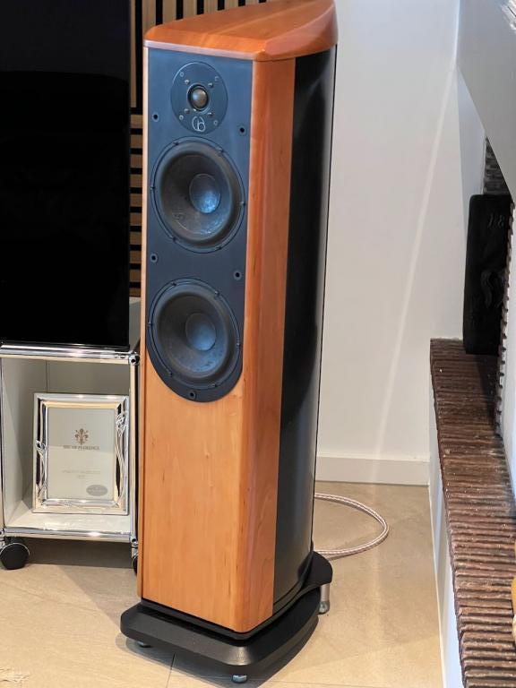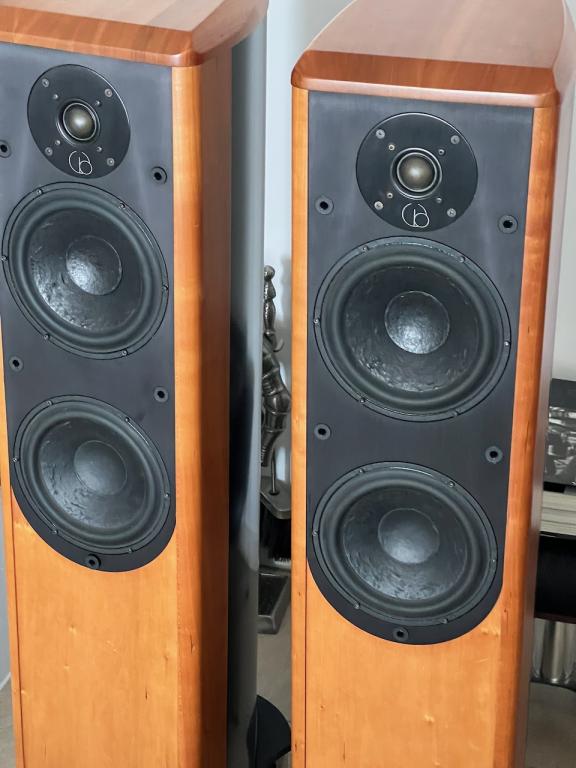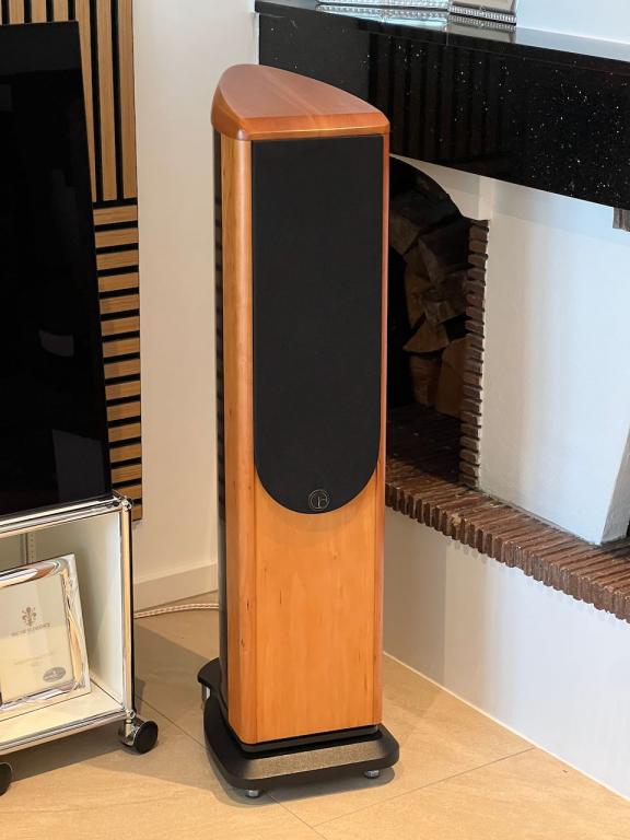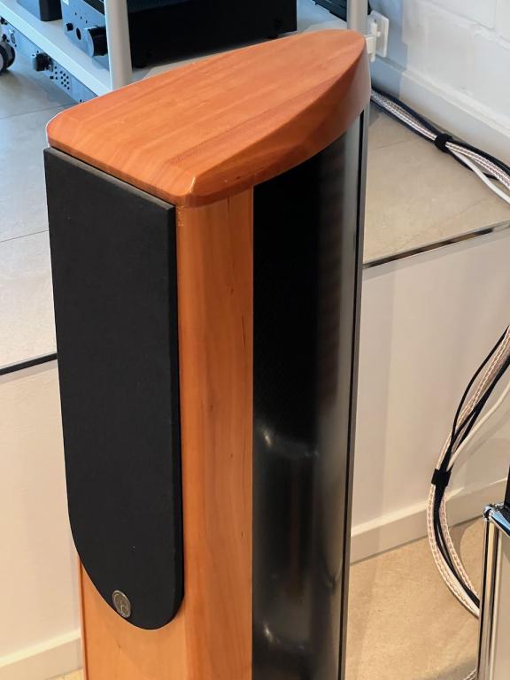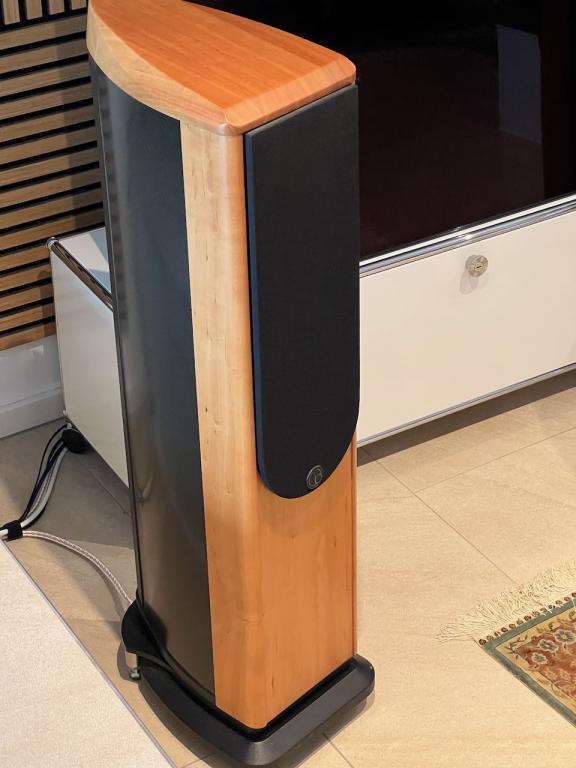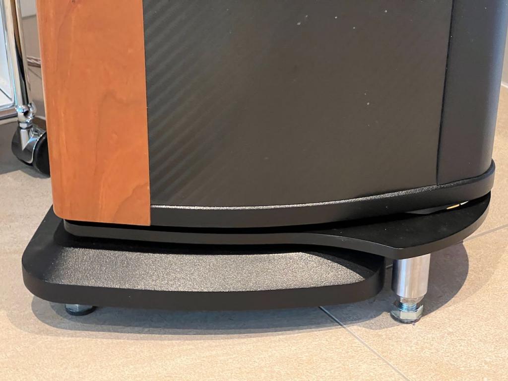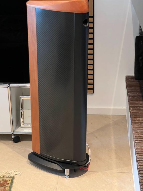 Das Gehäuse besteht teilweise aus Carbon. Das Holz ist sehr hochwertig verarbeitet. Zum sehr komplexen und stabilen Lautsprecherfuß gehören die original Spikes, die momentan auf den Fotos aber nicht installiert sind. Zum Lieferumfang gehört neben den Abdeckungen die original Bedienungsanleitung.