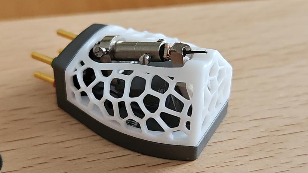 Nadelträger und Spulenkörper sind hier zum ersten Mal nicht aus zwei verschiedenen Materialien hergestellt, sondern aus einem einzigen winzigen Stück hochfester Keramik. Micha Huber spricht von einer Monobloc-Keramik. Das Ergebnis ist eine extrem hohe Steifigkeit und damit eine sehr exakte Schwingungsübertragung ohne jede Artefakte von der Nadelspitze bis zur Spule.