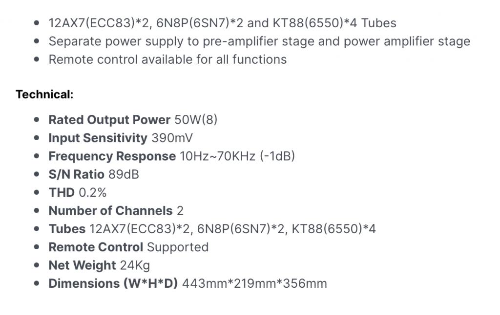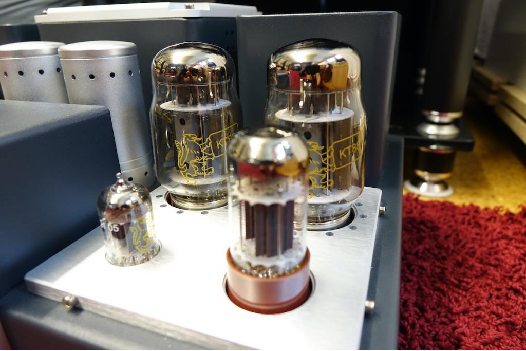 * Röhren: 4 x KT88(6550), 2 x ECC83 (12AX7), 2 x 6N8P(6SN7)