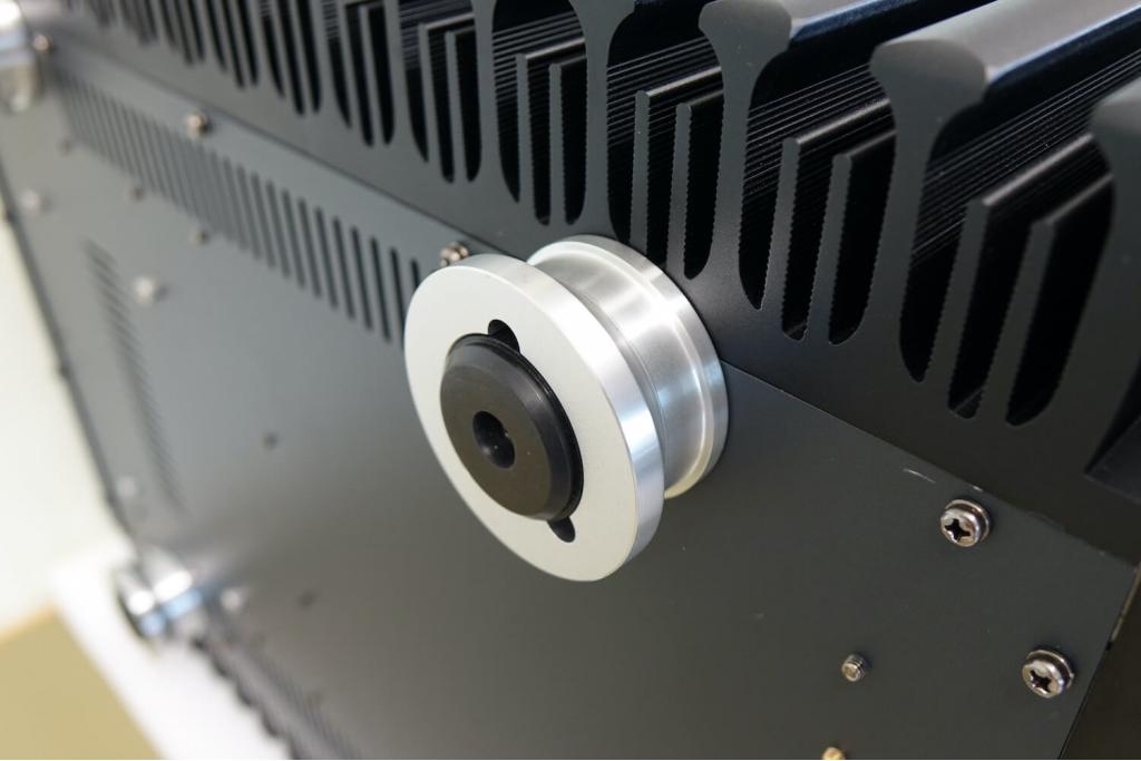Anders als bei vielen bekannten High-End Geräten deren Preise sich nicht selten im 5-stelligen Bereich bewegen, kann man gerne einmal einen Blick ins innere vom A600E werfen. Dann wird man sehen dass buchstäblich jeder Kubikzentimeter sinnvoll genutzt wird. Irgendwie müssen ja 53kg zustande kommen…aber auch aussen darf er sich ohne Rot zu werden in die vorderste Reihe einreihen! Denn die Verarbeitung ist exzellent und die Materialien nicht nur edel sondern auch äusserst massiv bemessen! Zudem sind die Füsse bereits ab Werk mit effektivem Schwingungsdämpfer ausgestattet.