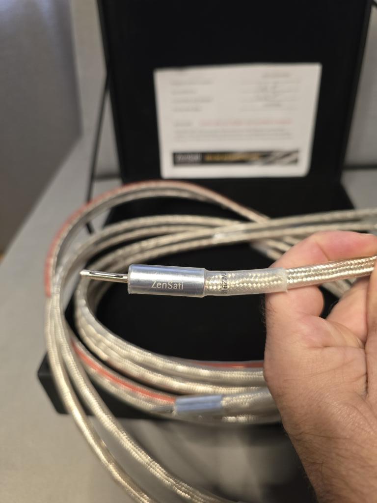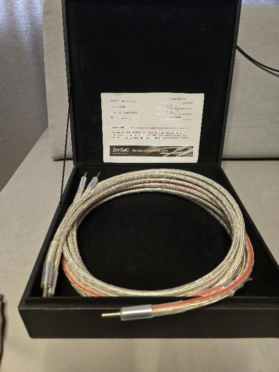 I'm selling ZenSati Authentica speaker cables. Very good condition. Length: 2 x 2 m. Banana plugs. Box and certificate of authenticity included. I used them with the Gryphon Diablo 300 and Raidho TD 1.2. I currently need longer cables, so this is a bargain. The dealer's price is around €7,500. They are still available from the manufacturer. Excellent sound quality, suitable for high-end sound systems.